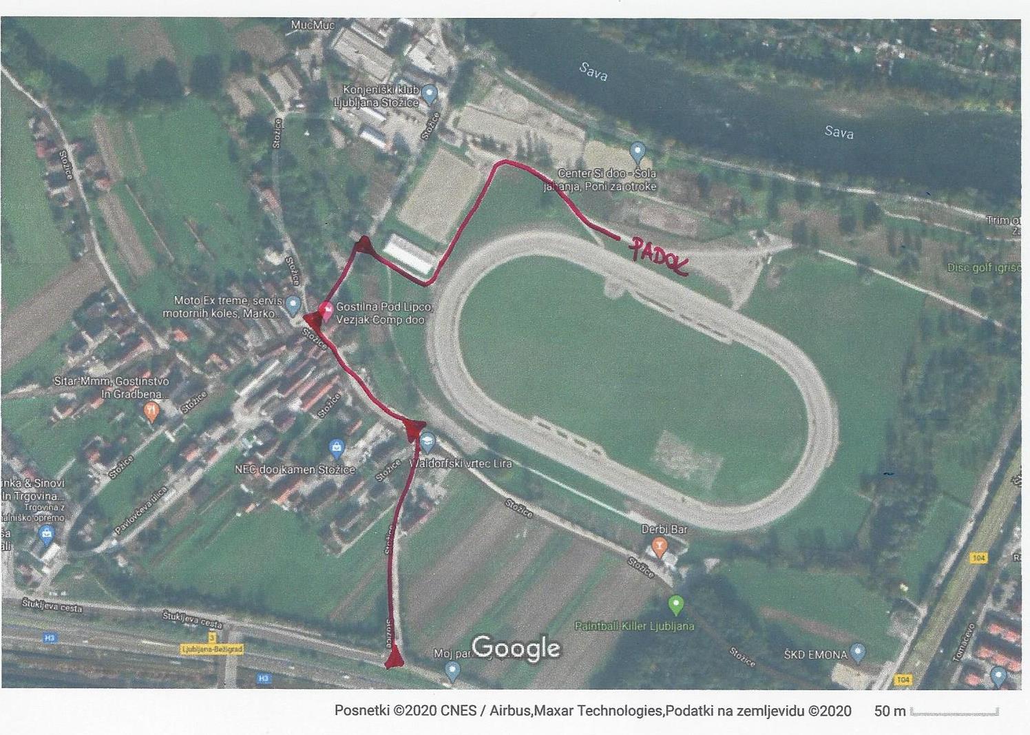 Na nedeljske dirke na hipodromu Stožice bo edini mogoč prihod kot je označeno na sliki spodaj.