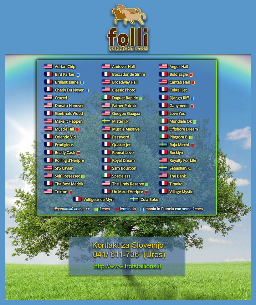 Obveščamo vse udeležence Šampionata Slovenije 2017; na hipodromu Brege pri Krškem , dne 4. junija - v organizaciji KK Posavje Krško, da bo tudi letos v sodelovanju z žrebčarno Folli in za spodbujanje slovenske reje, rejec zmagovalca Šampionata Slovenije 2017 prejel v plemenilni sezoni 2018; nagradni pripust od enega treh odličnih žrebcev po lastni izbiri :