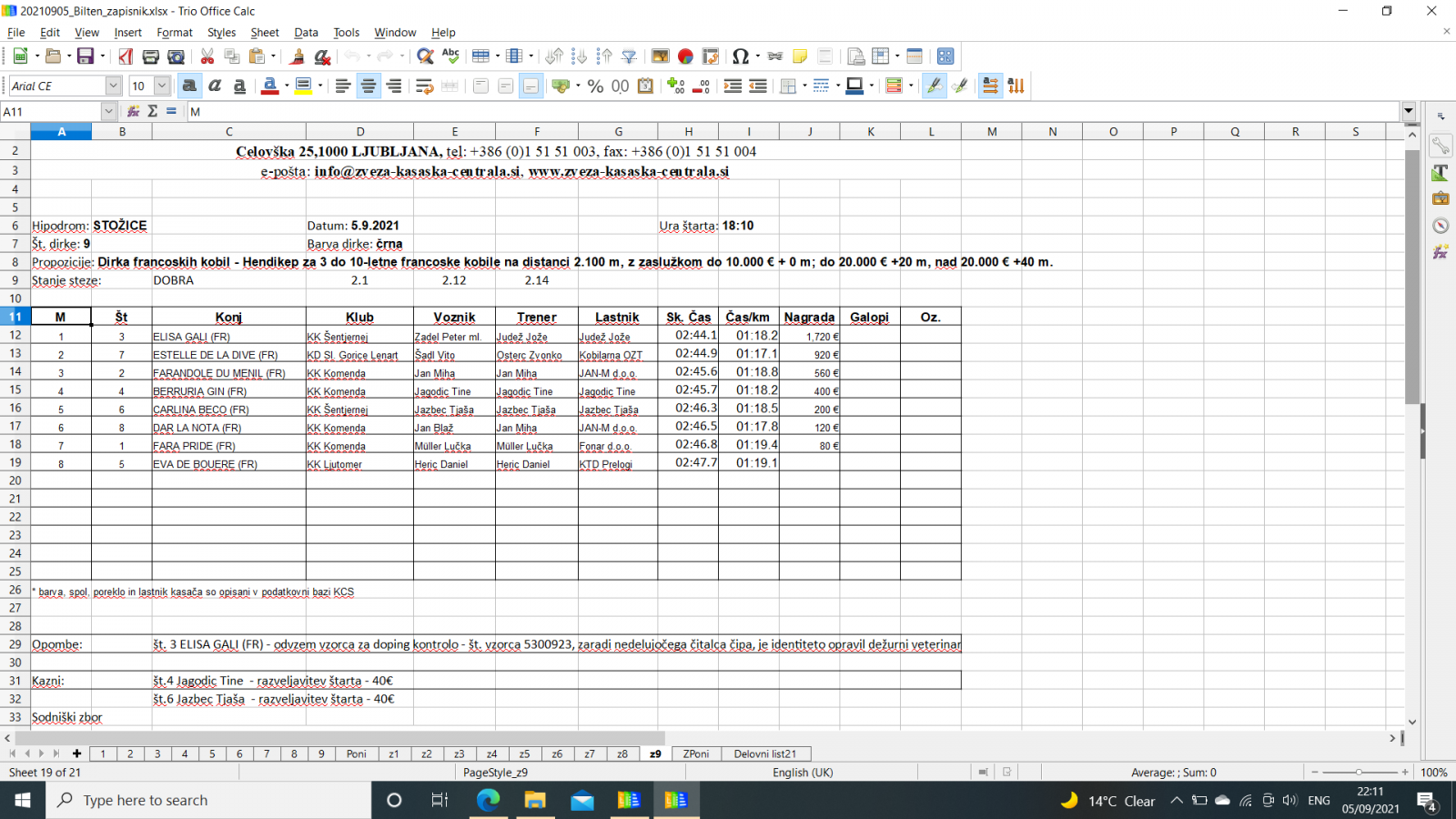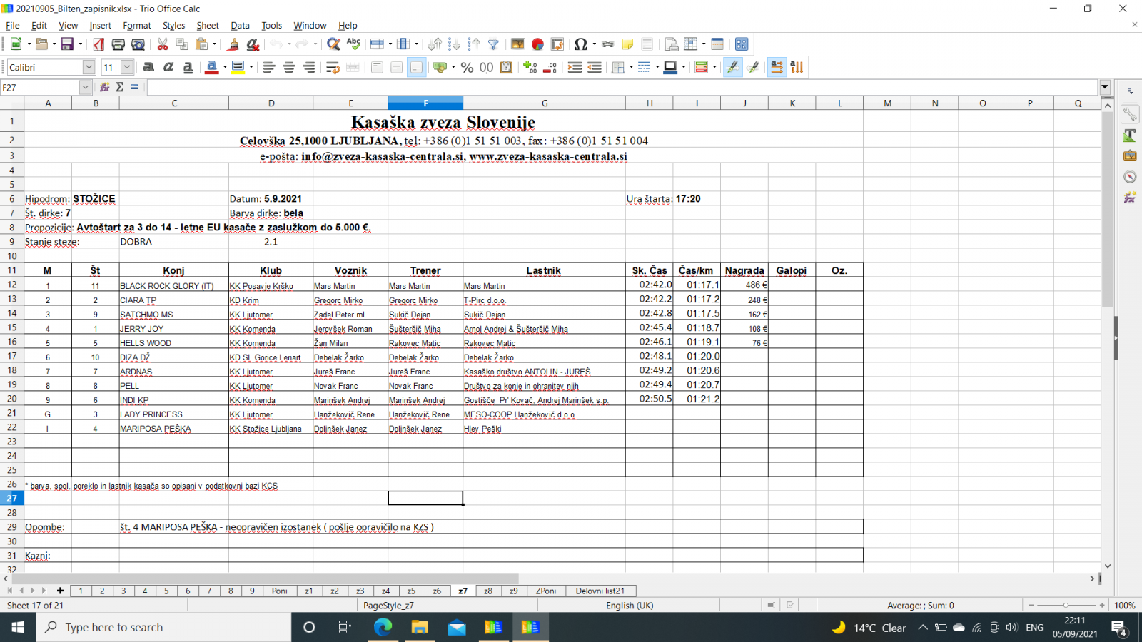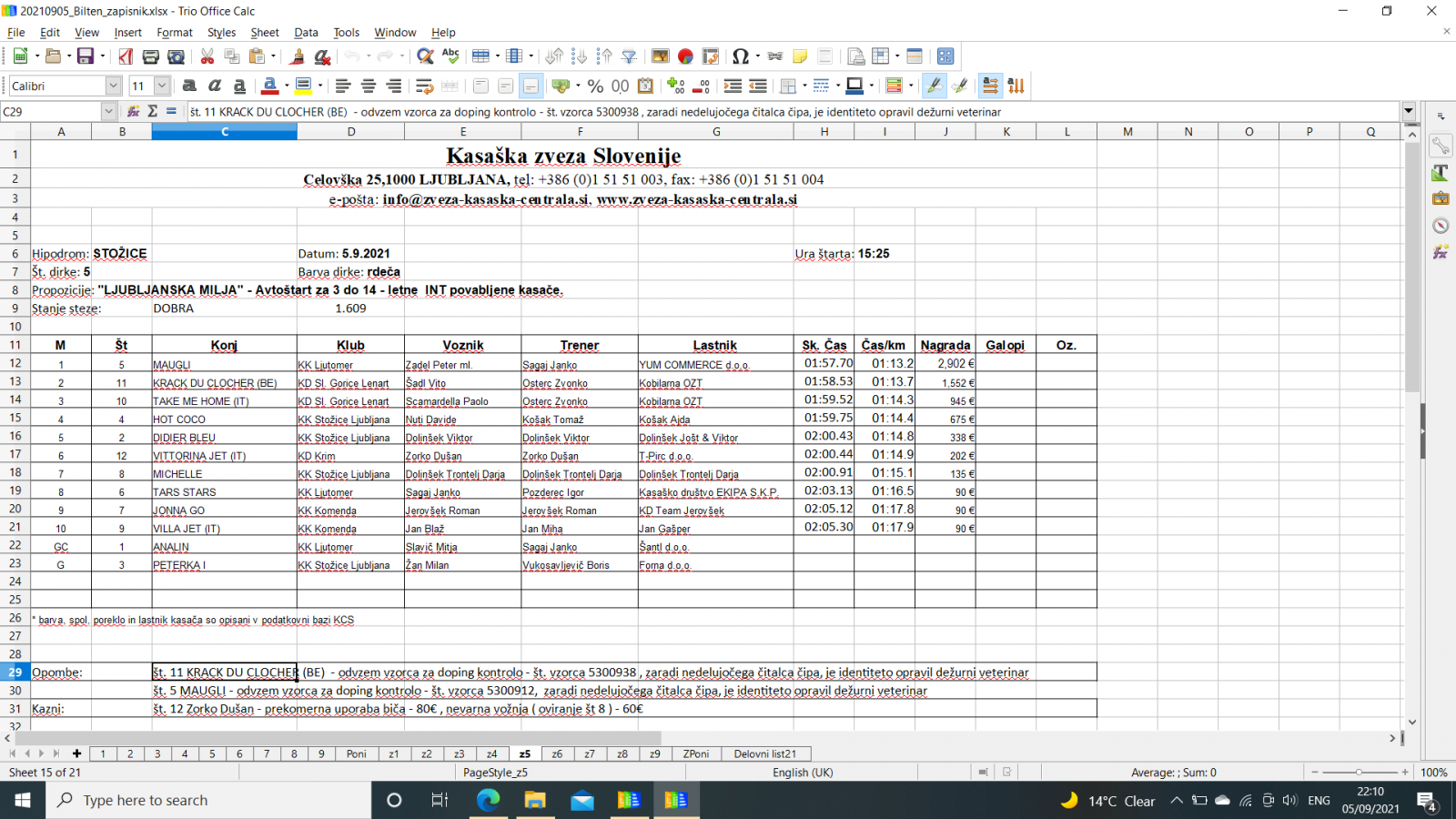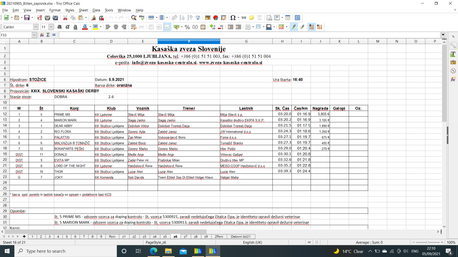 Na spodnjih povezavah najdete sodniške zapisnike iz Stožic, 5. 9. 2021.
